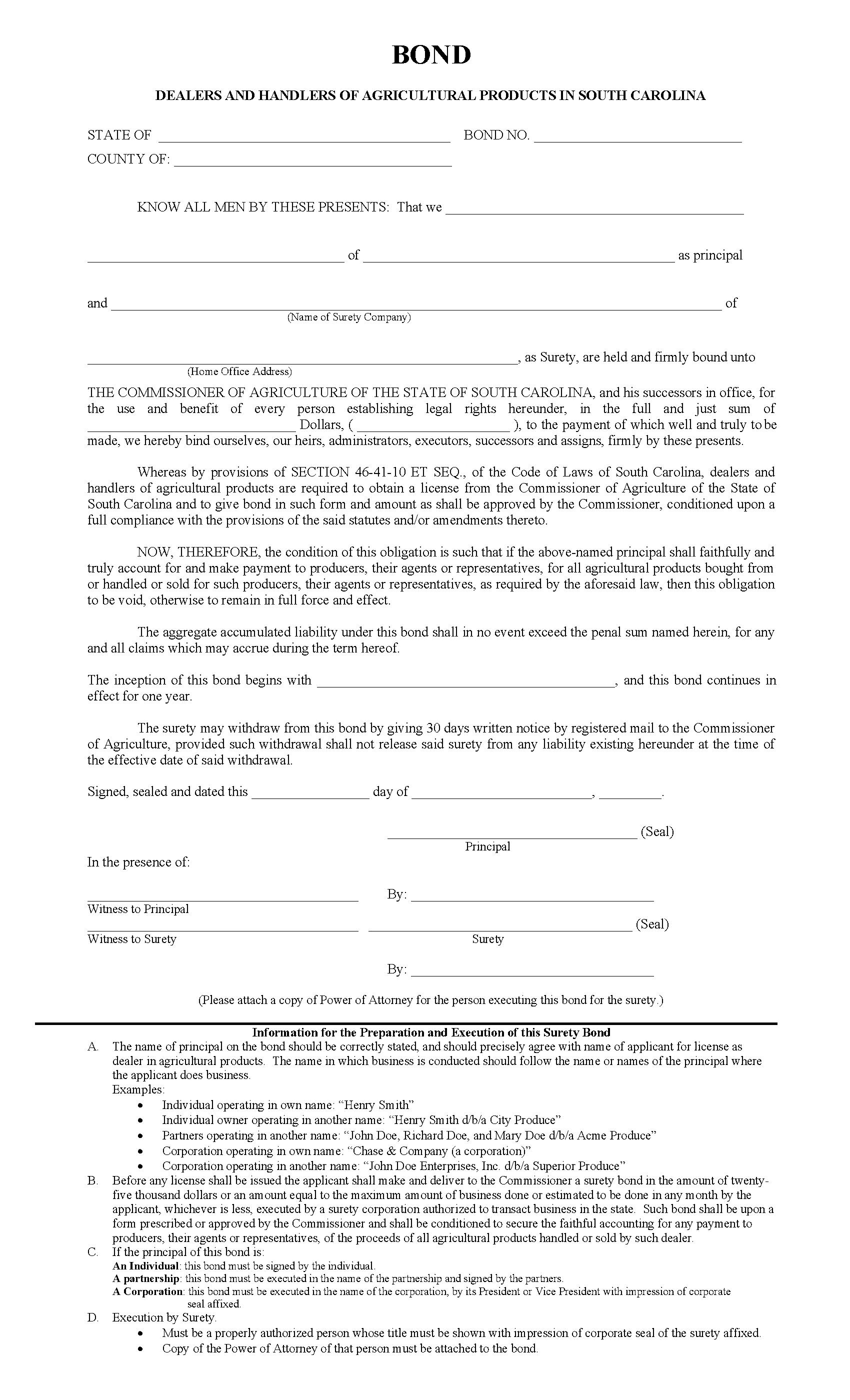 The South Carolina Dealers and Handlers of Agricultural Products Bond starts at $250 plus shipping costs and fees. Fill out the form to buy your bond instantly!