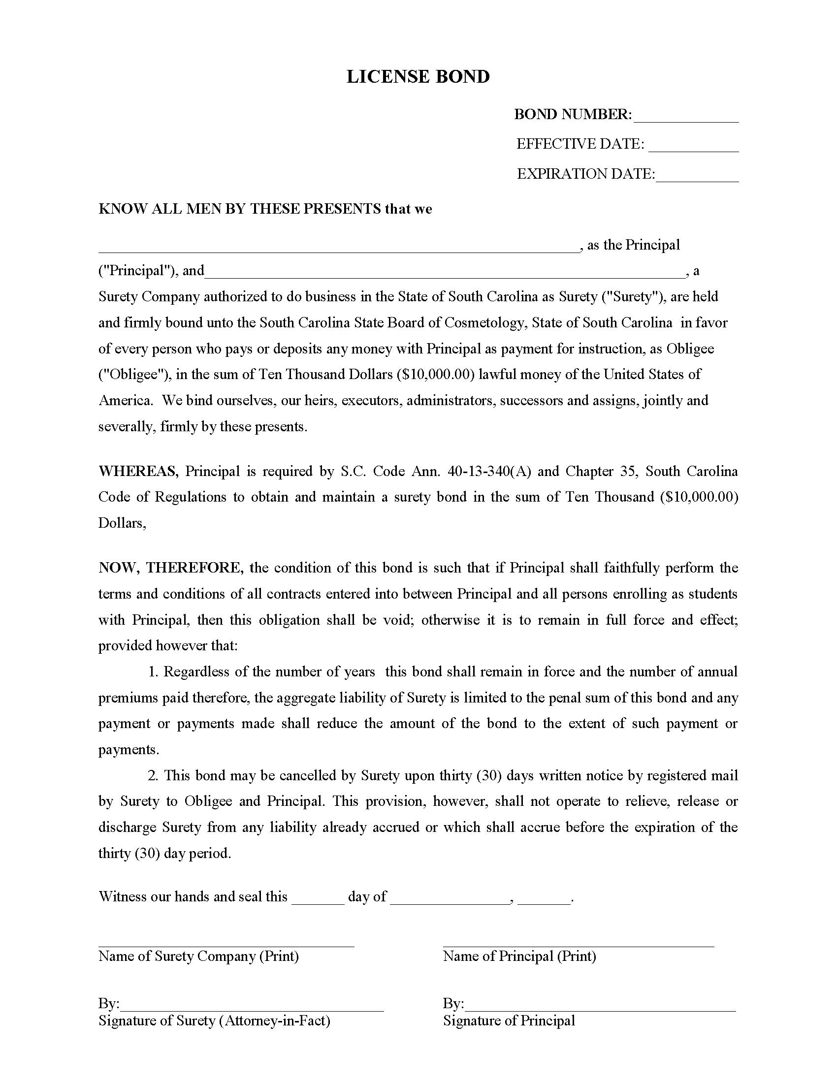 The South Carolina Cosmetology School Bond starts at $100 plus shipping costs and fees. Fill out the form to buy your bond instantly!