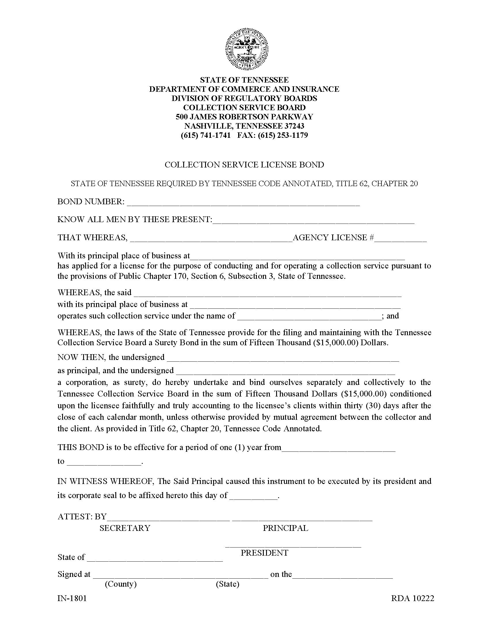 The Tennessee Collection Service License Bond starts at $150 plus shipping costs and fees. Fill out the form to buy your bond instantly!