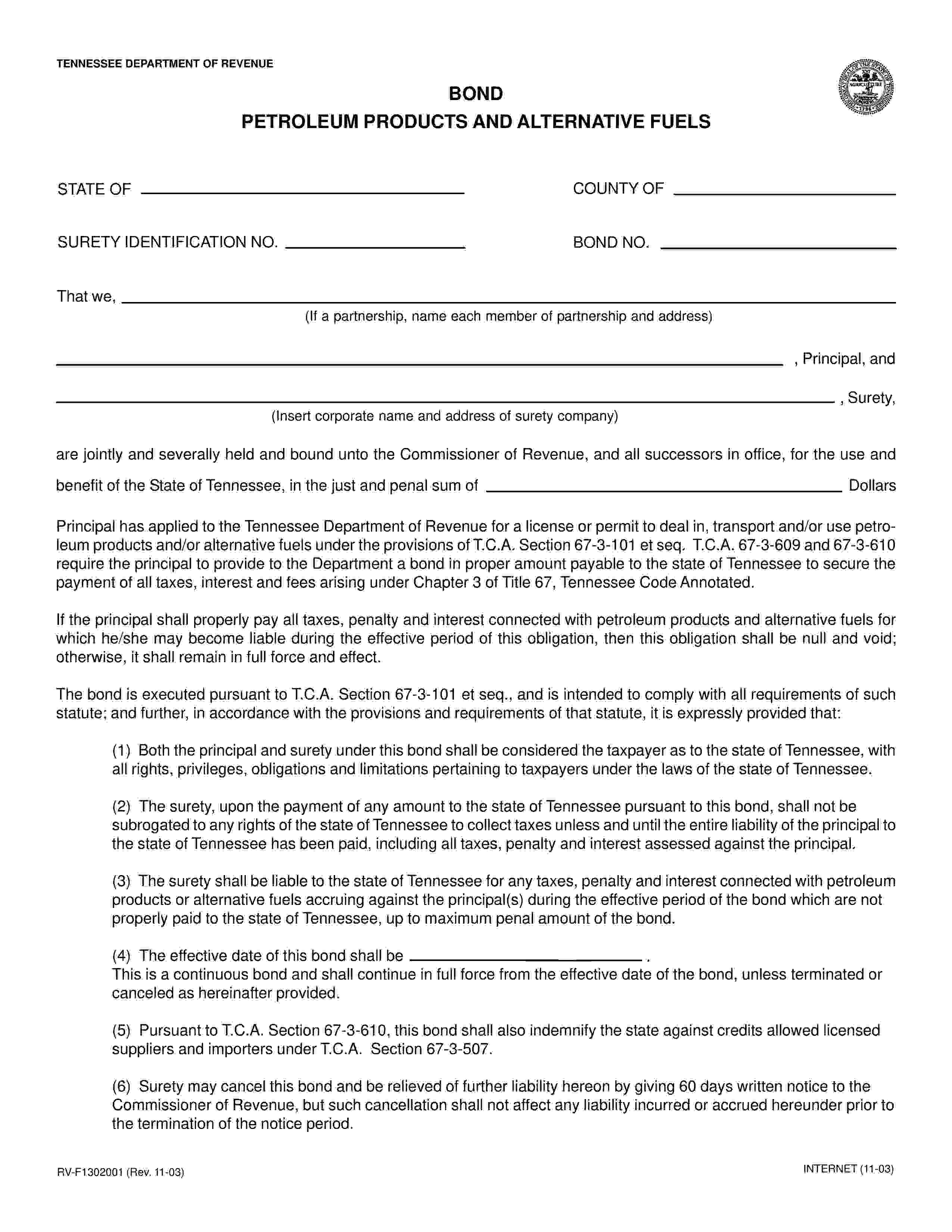 The Tennessee Petroleum Products and Alternative Fuels Bond starts at $100 plus shipping costs and fees. Fill out the form to buy your bond instantly!