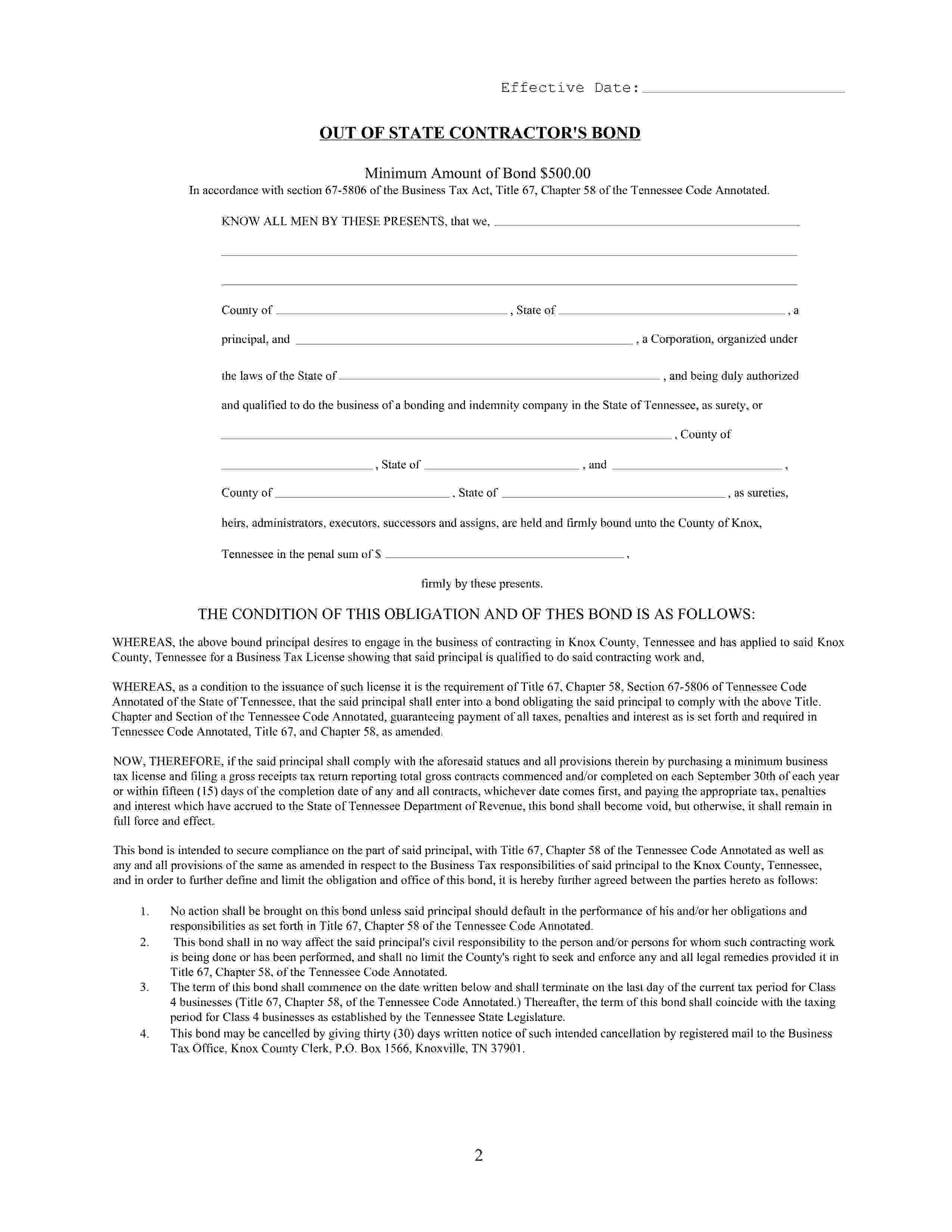 The Tennessee County of Knox Out of State Contractor Tax Liability Bond starts at $100 plus shipping costs and fees. Fill out the form to buy your bond instantly!