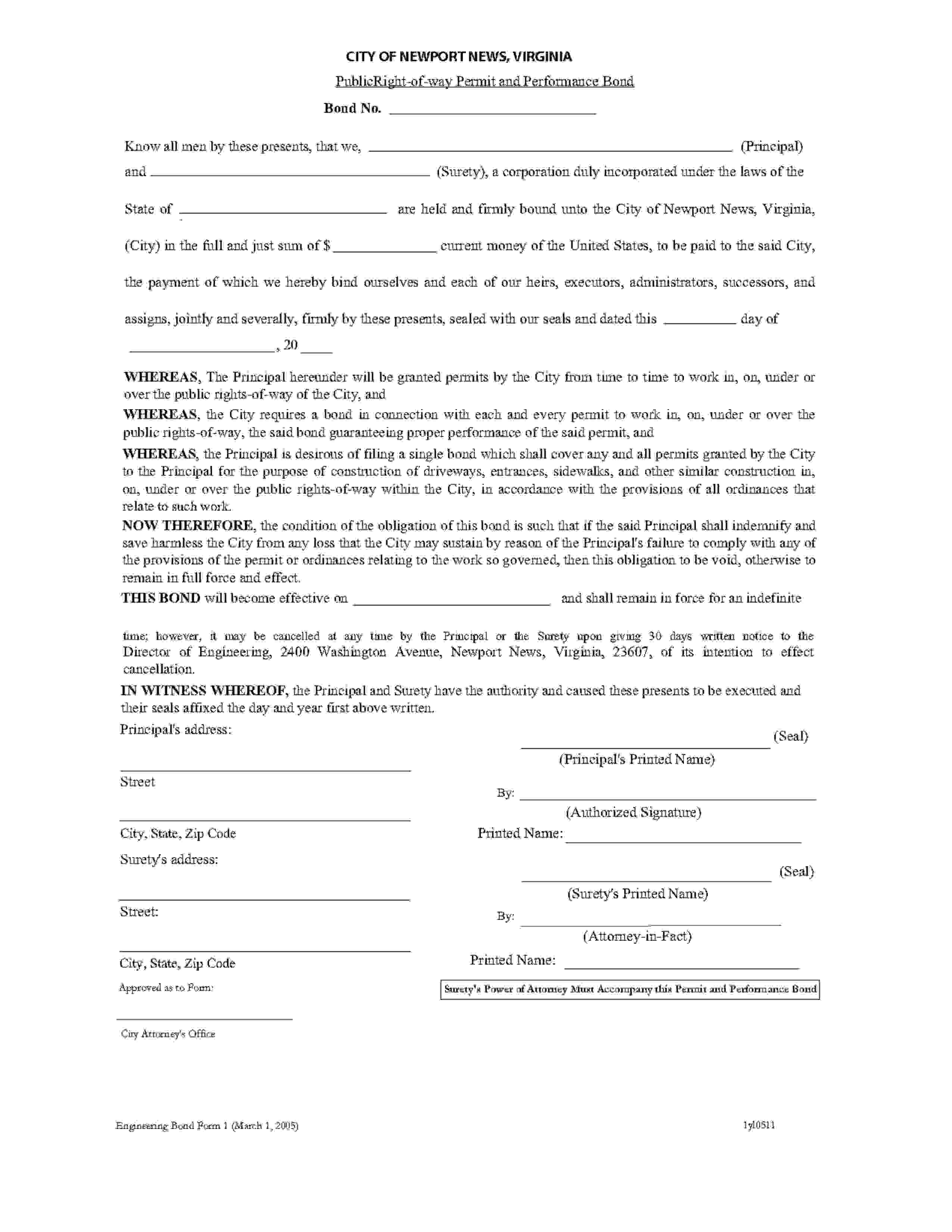 The Virginia City of Newport News Right of Way Permit Bond starts at $100 plus shipping costs and fees. Fill out the form to buy your bond instantly!