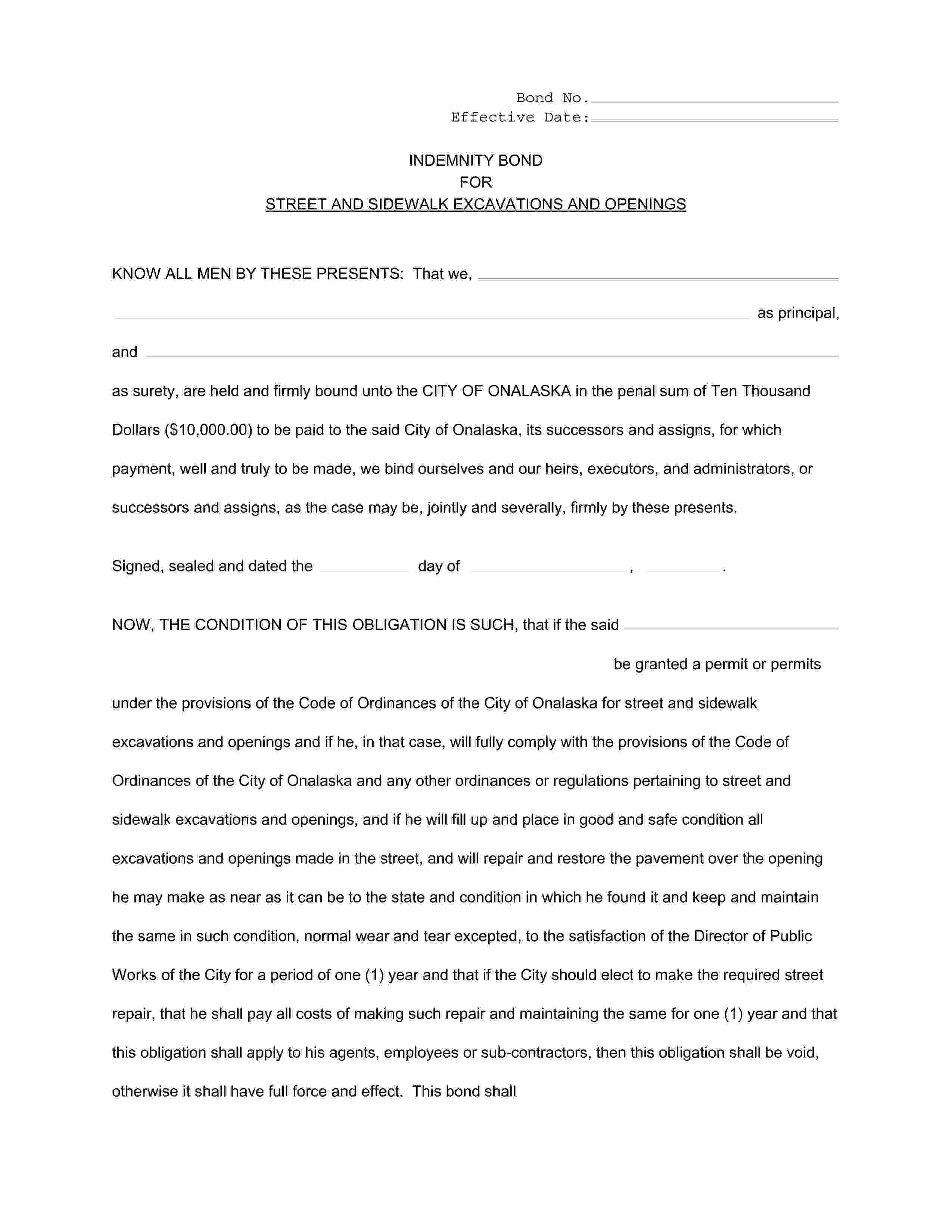 The Wisconsin Onalaska - City Street and Sidewalk Excavations and Openings Bond starts at $100 plus shipping costs and fees. Fill out the form to buy your bond instantly!
