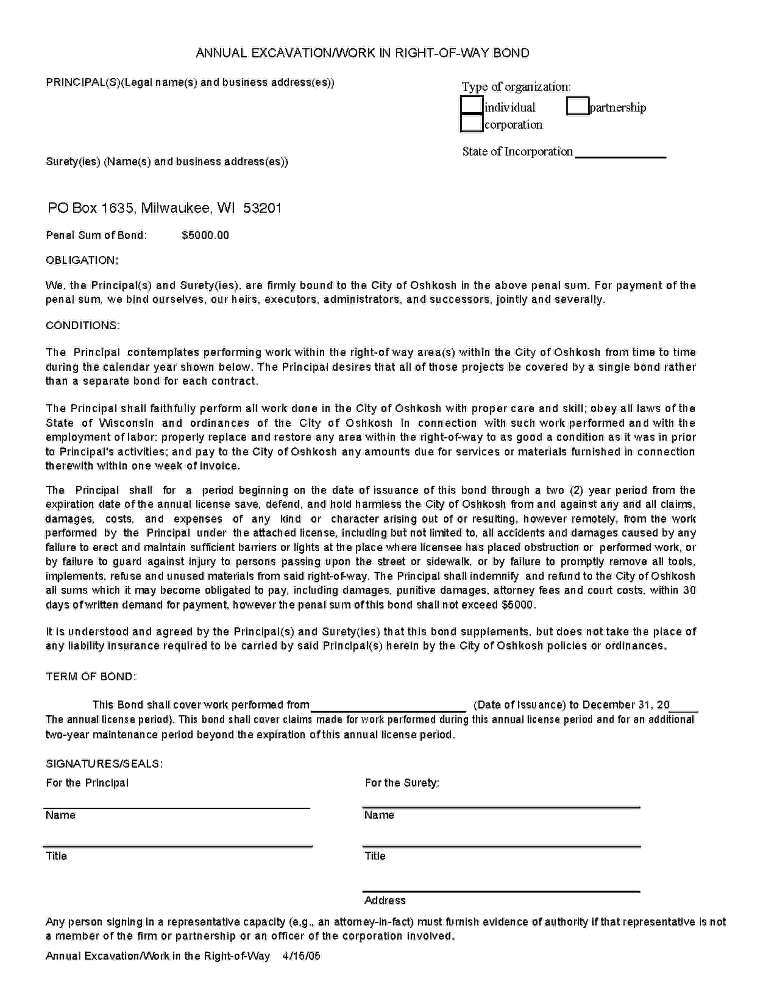 The Wisconsin Oshkosh - City Annual Excavation / Work in Right-of-Way Bond starts at $100 plus shipping costs and fees. Fill out the form to buy your bond instantly!