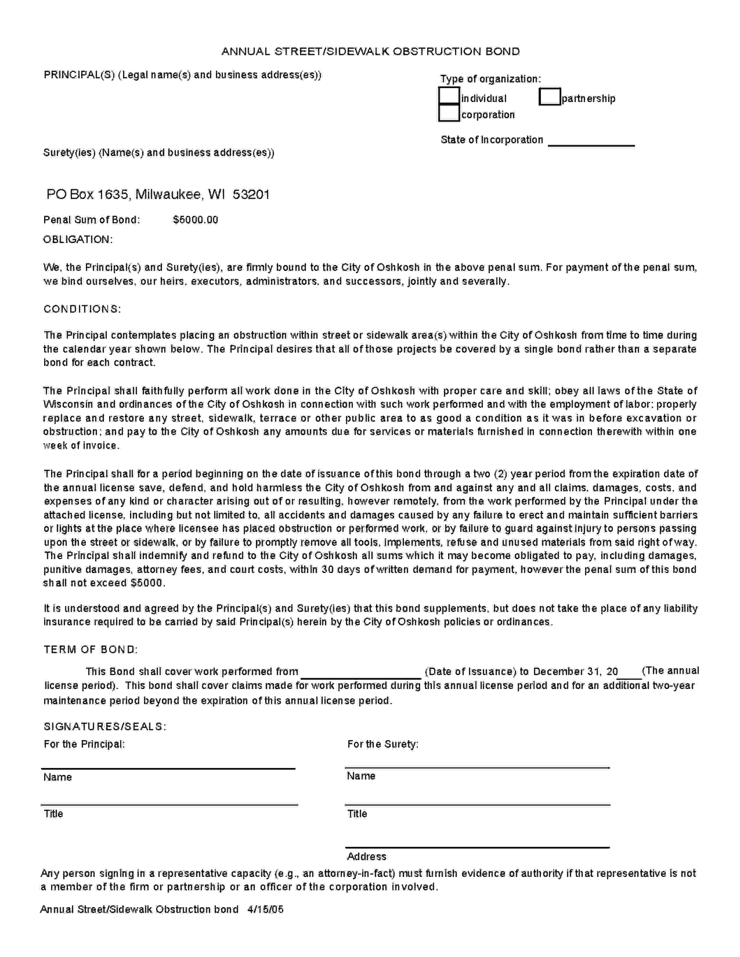 The Wisconsin Oshkosh - City Annual Street / Sidewalk Obstruction Bond starts at $100 plus shipping costs and fees. Fill out the form to buy your bond instantly!