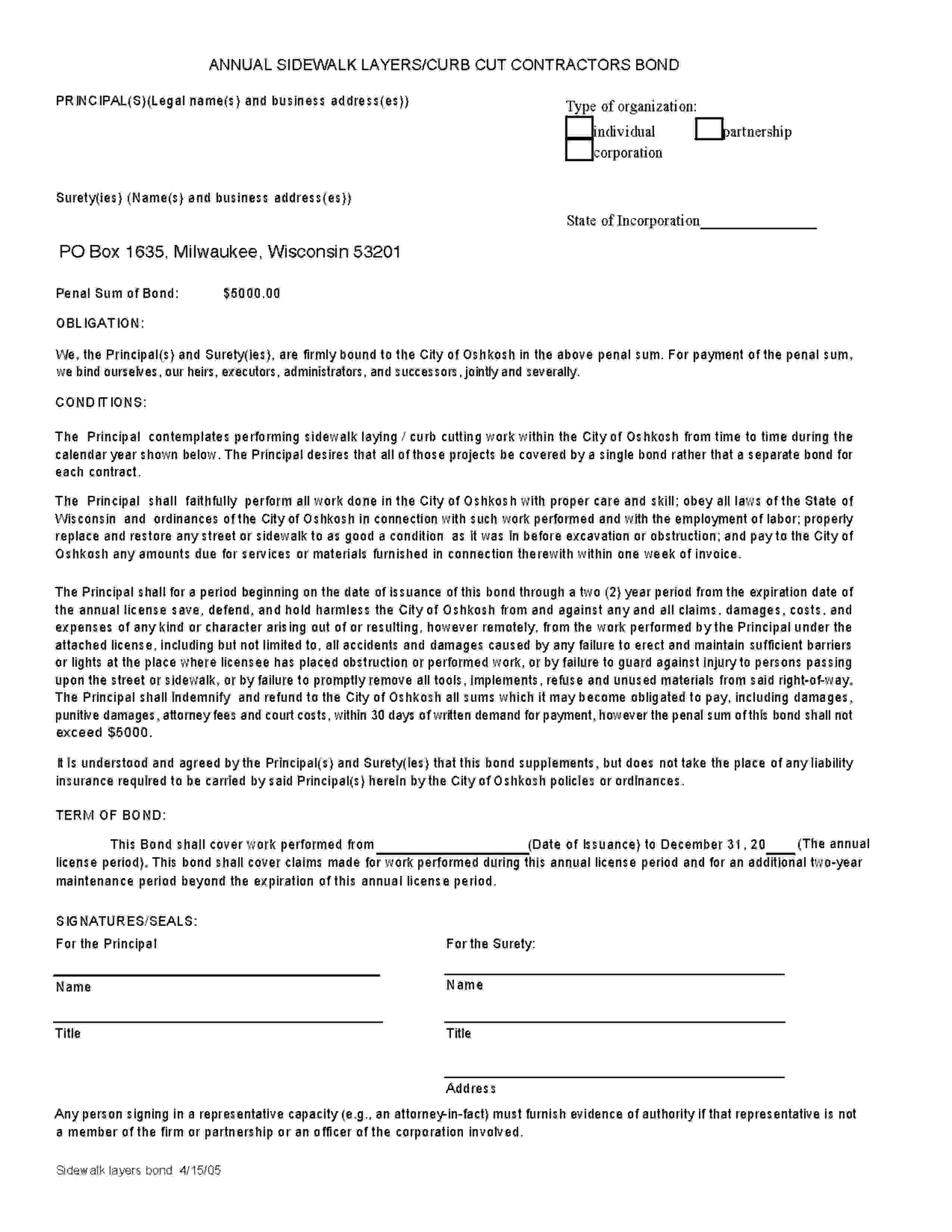 The Wisconsin Oshkosh - City Annual Sidewalk Layers / Curb Cut Contractors Bond starts at $100 plus shipping costs and fees. Fill out the form to buy your bond instantly!
