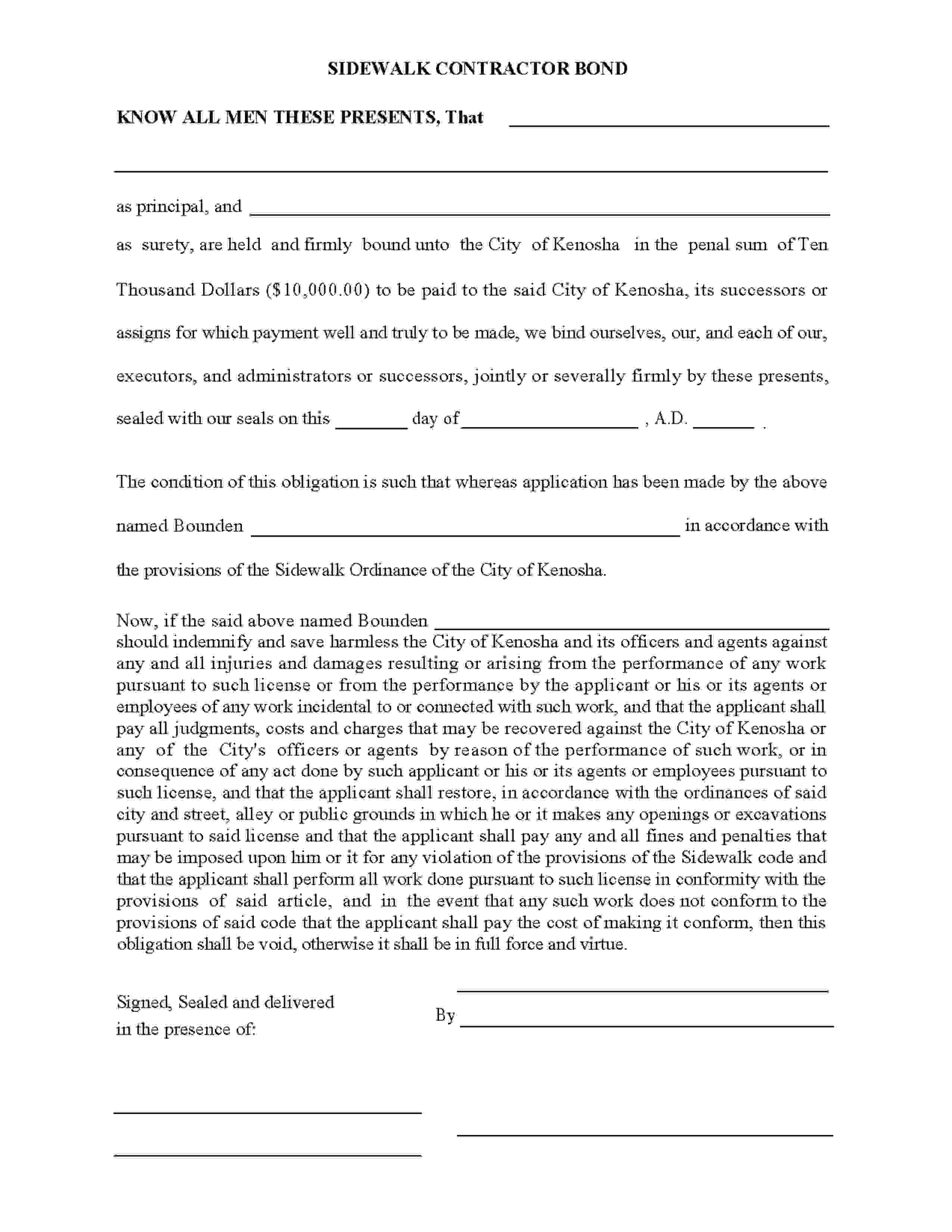 The Wisconsin Kenosha - City Owners Sidewalk/Driveway Performance Bond starts at $100 plus shipping costs and fees. Fill out the form to buy your bond instantly!