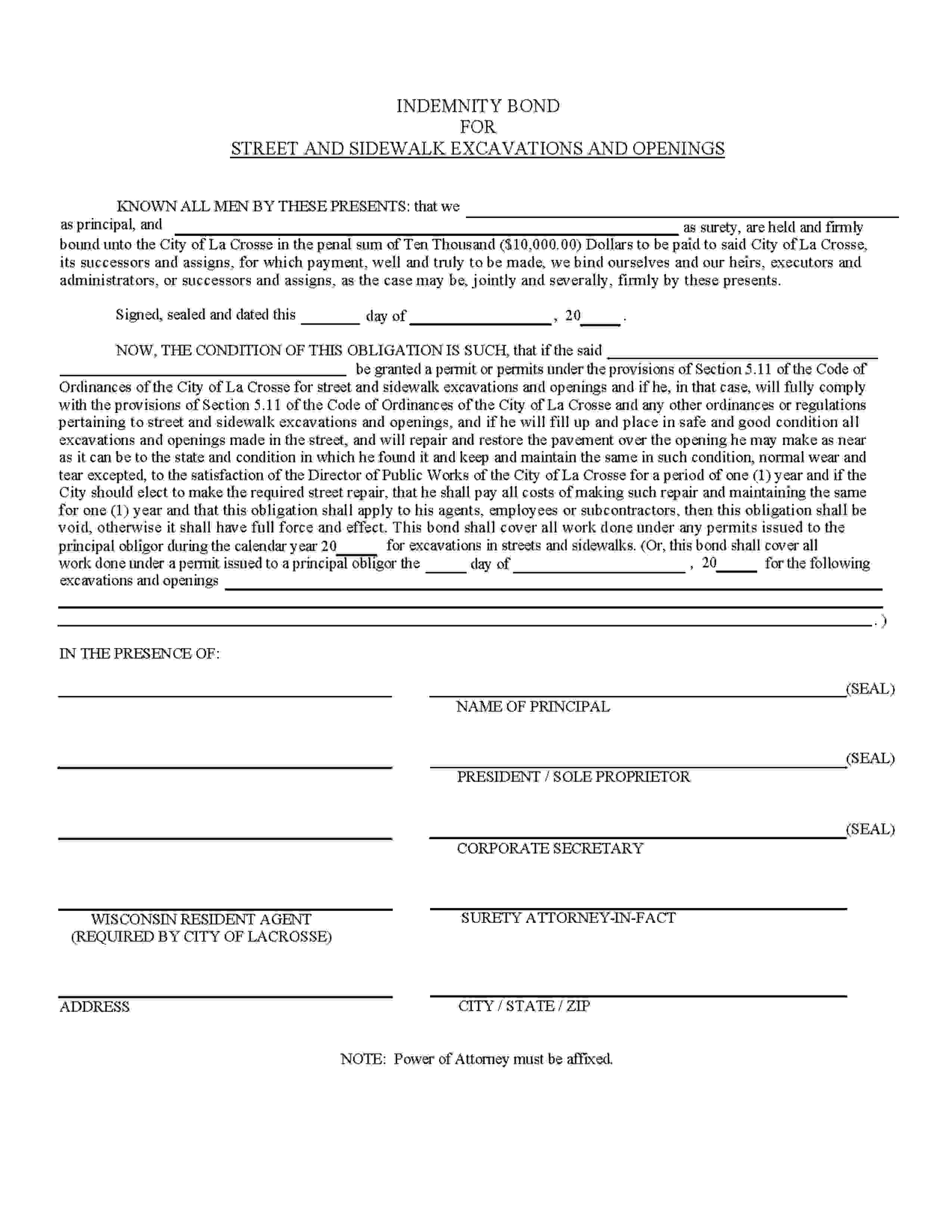 The Wisconsin La Crosse - City Street and Sidewalk Excavations and Openings Bond starts at $100 plus shipping costs and fees. Fill out the form to buy your bond instantly!